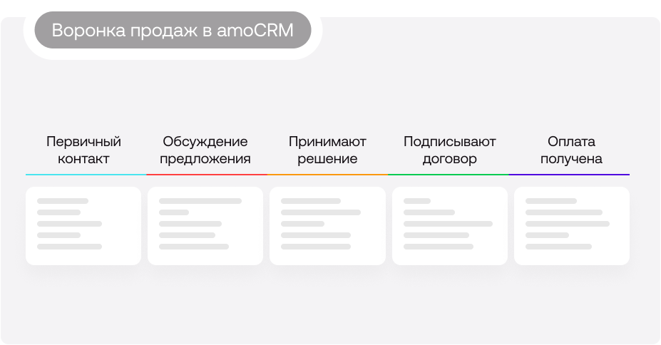 Воронка продаж — это модель движения клиента по пути от знакомства с продуктом к его покупке. В идеале она имеет форму трубы, но есть и другие разновидности схемы. Поэтому этапы в amoCRM или другой платформе для управления взаимодействием с клиентами могут различаться. Чаще всего план включает 5–6 основных стадий: