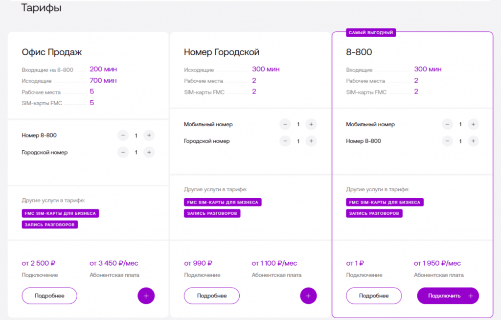 Сотрудники общаются в корпоративном чате, проводят онлайн-конференции прямо из браузера (в сервисе от МТТ), а бизнесмен получает дополнительные инструменты для развития. Так, виджет обратного звонка на сайте увеличивает продажи на 30–75 %. А возможность настраивать сценарии переадресации позволяет организовать эффективную работу сотрудников, которые находятся в различных часовых поясах. . Выбор лучше сделать в пользу тарифов, скомпонованных конкретно под онлайн-магазины.